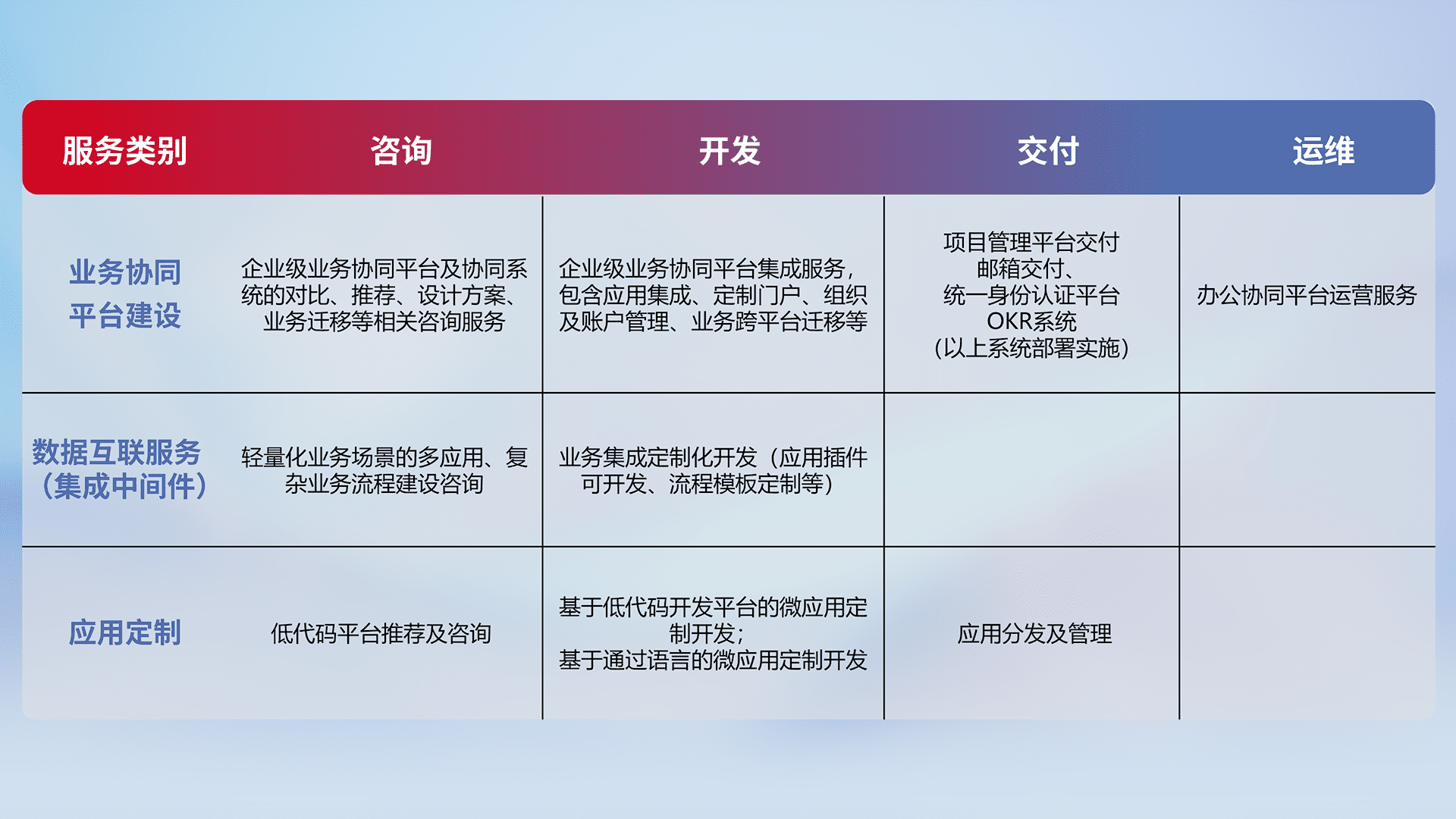 针对钉钉、、、企微、、IDaas等平台级产品提供产品的规划、、、方案、、交付、、、、定制化开发等服务,,,,实现如统一协同办公、、、智能客户服务、、混合会议管理、、、智能数据查询、、、等业务场景,,实现数字化转型。。。。
